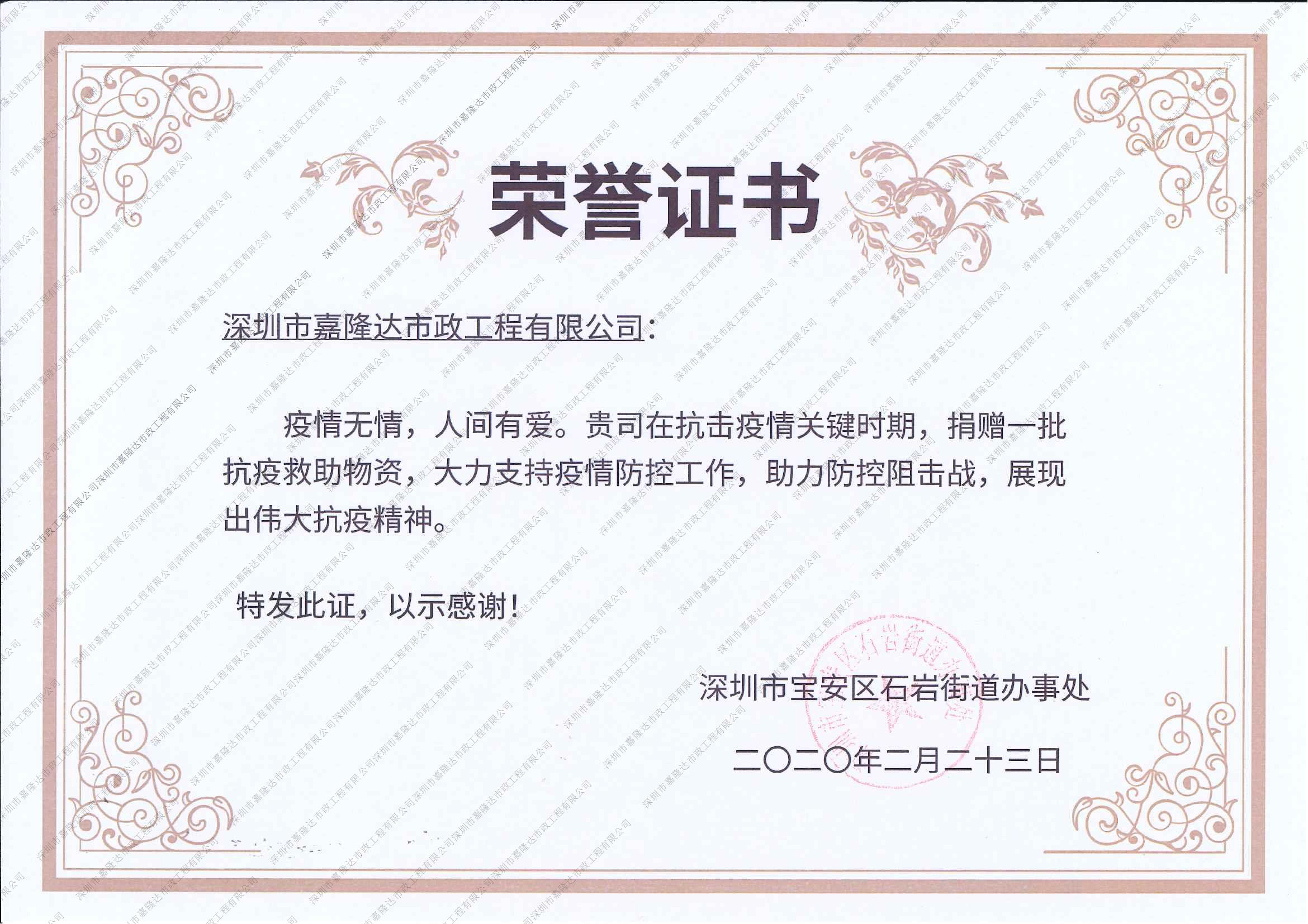 疫情捐贈(zèng)榮譽(yù)證書