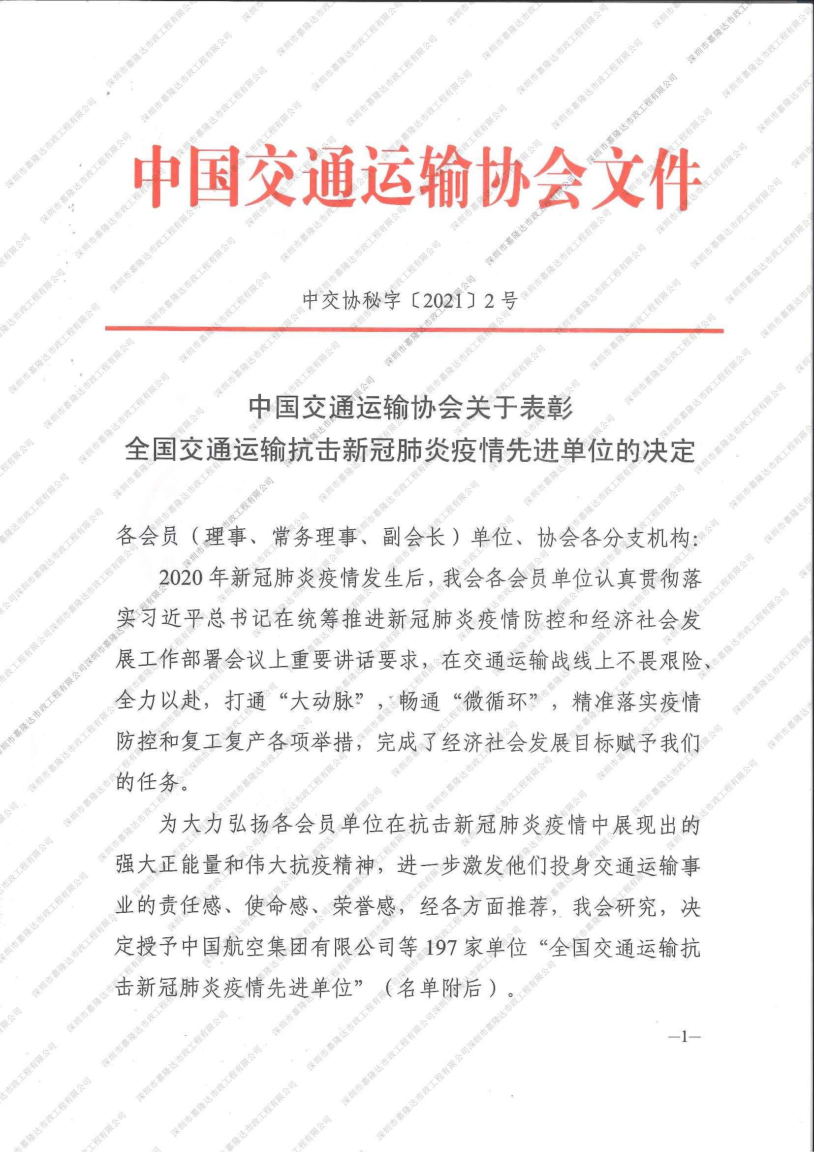 全國交通運輸抗擊新冠肺炎疫情先進單位 -